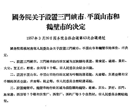 “三門峽市是伴隨著黃河三門峽水利樞紐工程的興建而誕生的。”今年86歲的王文彬是中國水利水電第十一工程局退休的副總工程師,說起三門峽市的建立,他異常激動。作為三門峽大壩第一批建設(shè)者,王文彬于1954年來到黃河水利委員會設(shè)立的黃河潼(關(guān))孟(津)段勘測工作辦事處工作,為三門峽大壩工程做準備工作。因為是在設(shè)市之前來到這里,所以王文彬見證了三門峽這座城市的誕生。 王文彬還記得他第一次來到三門峽時的情景。當時是在老車站(會興車站)下的火車,那時的三門峽還沒有建市,還是會興鎮(zhèn),眼前到處溝壑縱橫,沒有一條像樣的路,出行的交通工具是毛驢,建筑大多是土坯房,沒有電燈,大家都用馬燈照明……之后,隨著三門峽大壩的建設(shè),全國各地有志之士會聚三門峽,很快,這座城市的道路修起來了,燈亮起來了,市場、商場、學(xué)校、醫(yī)院和劇場等應(yīng)運而生。 如王文彬所言,國務(wù)院決定設(shè)立三門峽市后,一系列工作隨即展開,一座在古老的崤函大地上重新建立起來的年輕城市快速成長。1957年4月,中共河南省委決定成立三門峽市政委員會,直屬河南省人民委員會領(lǐng)導(dǎo),代市長李浩,代副市長孫世祿、段炳林,三門峽工區(qū)人民政府隨之撤銷。5月11日,中共河南省委決定成立中共三門峽市委員會,隸屬河南省委領(lǐng)導(dǎo),代理市委書記劉子厚,書記處書記張海峰、李浩,市委常委齊文川、孫世祿、段炳林,中共三門峽工區(qū)委員會同時撤銷。7月11日,經(jīng)中央批準,黃河三門峽工程局局長劉子厚兼任中共三門峽市委第一書記。新建立的三門峽市行政區(qū)域為原工區(qū)所轄區(qū)域,總?cè)丝?9081人。為了保障新建市的蔬菜、副食品供應(yīng),支援水利樞紐工程建設(shè),市委又設(shè)立了中共三門峽市郊區(qū)委員會和郊區(qū)人民政府(縣級),下轄8個鄉(xiāng)。 機構(gòu)設(shè)置完成后,市委高度重視三門峽水利樞紐工程建設(shè)的生產(chǎn)、生活等物資供應(yīng),在三門峽工區(qū)原有的基礎(chǔ)上,擴大調(diào)整了供應(yīng)機構(gòu),增加了服務(wù)人員。為方便參與三門峽水利樞紐工程建設(shè)的職工生活,市委本著“缺什么發(fā)展什么”的原則,專門從洛陽引來理發(fā)、縫紉、洗染、照相、甜食等店鋪,滿足職工需要。1958年,市委提出了“把三門峽市建設(shè)成為一個新興的工業(yè)城市”的方針。同年4月,經(jīng)國務(wù)院批準,陜縣(今陜州區(qū))菜園、東凡兩個鄉(xiāng)的19個村劃歸三門峽市,擴大了市郊蔬菜種植面積,培育了蔬菜生產(chǎn)基地,使水利建設(shè)職工生活有了保障。 今年88歲的高發(fā)俊在三門峽建市時正值壯年,土生土長的他當時擔任韓莊村二組隊長職務(wù)。“當時聽說要成立三門峽市,我們都非常高興。”高發(fā)俊回憶,他們村很快就被劃歸三門峽市管,按照上級領(lǐng)導(dǎo)的要求,他們?nèi)σ愿案闵a(chǎn),村民們個個熱情高漲,用自己辛勤的雙手努力種糧種菜。作為隊長的他干勁十足,后來還擔任了韓莊村村支書。 此后的幾十年,因為種種原因,三門峽市行政區(qū)劃幾經(jīng)調(diào)整。 1958年12月8日,國務(wù)院批準河南省關(guān)于省轄市領(lǐng)導(dǎo)關(guān)系和行政區(qū)劃的意見,三門峽市劃歸洛陽地區(qū)代管。1959年6月,為了統(tǒng)一規(guī)劃,便于生產(chǎn)建設(shè)和加強領(lǐng)導(dǎo),河南省委決定,陜縣劃歸三門峽市,中共三門峽市郊區(qū)委員會歸陜縣縣委領(lǐng)導(dǎo)。同年11月,根據(jù)河南省委和洛陽地委指示精神,撤銷陜縣建制,陜縣下轄的8個人民公社統(tǒng)歸三門峽市領(lǐng)導(dǎo),縣直各部門與三門峽市直各部門對口合并。1960年2月,三門峽市人民委員會決定,原陜縣各公社編入三門峽市郊區(qū)。 1961年10月,經(jīng)河南省委批準,恢復(fù)陜縣建制,三門峽市調(diào)整為縣級市,均隸屬洛陽地區(qū)領(lǐng)導(dǎo),行政區(qū)域劃分基本上按照1959年市、縣合并前各自所轄的范圍。市、縣“分家”后,三門峽市轄市區(qū)及崖底、交口、會興、磁鐘和高廟5個郊區(qū)公社。全市總?cè)丝?15107人,其中農(nóng)業(yè)人口45860人,非農(nóng)業(yè)人口69247人。 這一過程,雖然曲折不易,但本著“服務(wù)于水利樞紐工程建設(shè)”的方針,三門峽市擬定了城市規(guī)劃,市政建設(shè)有聲有色。建設(shè)了東至?xí)d車站,西至上官村,南至南澗河,北至黃河岸的湖濱區(qū),修建了黃河路、建設(shè)路、和平路和六峰路等多條市區(qū)道路,并進行了城市綠化。至1961年年底,全市共建生產(chǎn)用建筑25808平方米,民用建筑265144平方米,市區(qū)主要道路36.16公里,排水工程25.56公里。 地方工業(yè)也隨之得到較快發(fā)展,國家和地方加大投資力度,相繼建立了鋼鐵、煉鋁、煤炭、機械、建材等工業(yè),總產(chǎn)值從1957年的140多萬元發(fā)展到1960年的11141.3萬元。農(nóng)業(yè)生產(chǎn)也很迅速,1960年年底實有耕地770944畝,農(nóng)副業(yè)總產(chǎn)值達2104萬元。全市總?cè)丝?960年年底為361135人,其中農(nóng)業(yè)人口226853人,非農(nóng)業(yè)人口134282人。其他如交通運輸、郵電、財貿(mào)等事業(yè)也都蓬勃發(fā)展。 1986年,三門峽的行政區(qū)劃再次調(diào)整。當年1月,經(jīng)國務(wù)院批準,三門峽市重新升級為地級市;4月,升級后的