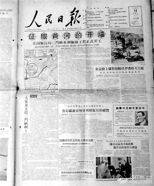 峽谷里響起爆炸的轟鳴,從此,人們要在這里鑿開峭壁,攔住洪流,使千年為害的黃河永遠(yuǎn)為人民造福 新華社三門峽13日電 舉國矚目的治理和開發(fā)黃河的三門峽水利樞紐工程今天正式開工了。 上午,隆重的開工典禮在三門峽河中間的鬼門島和河南岸的山坡上舉行。主席臺(tái)在鬼門島上,面對(duì)著屹立在激流中的中流砥柱。臺(tái)上兩旁懸掛著“根治水害,開發(fā)水利”的對(duì)聯(lián)。高大的標(biāo)語塔、彩色的旗幟、巨幅的大壩示意圖、明媚的陽光、奔騰的河水和河谷兩岸斑駁的巖石輝映著,使會(huì)場顯得格外的雄偉和美麗。和鬼門島相對(duì)的南岸獅子頭的巖石上,原刻著“峭壁雄流鬼斧神工”八個(gè)大字的地方也有一副對(duì)聯(lián),寫著“根治水害有日,黃河變清有期”。 參加開工典禮的有三門峽工程局的職工,壩址附近的農(nóng)民,中央有關(guān)部門和甘肅、陜西、山西、河南等省的負(fù)責(zé)人,壩址所在地的河南省陜縣和山西省平陸的黨政機(jī)關(guān)代表和幫助我國進(jìn)行三門峽工程設(shè)計(jì)和施工的蘇聯(lián)專家共五千多人。 九時(shí)四十五分,開工典禮在波濤伴奏的國歌聲中開始。 三門峽工程局局長劉子厚致詞。他首先對(duì)蘇聯(lián)專家的幫助和全國人民的支援表示感謝。接著,對(duì)三門峽水利樞紐工程的規(guī)模和意義作了概述。他說,今年施工的方針是主體工程和準(zhǔn)備工作并重。今年要開挖左岸的壩基石方四十萬公方,開始修筑第一期圍堰,并完成靈寶砂石篩分廠的部分建筑工程。他號(hào)召全體職工在施工中要堅(jiān)決貫徹國家增產(chǎn)節(jié)約的精神,開展先進(jìn)生產(chǎn)者運(yùn)動(dòng)。 接著講話的有黃河流域規(guī)劃委員會(huì)副主任、水利部部長傅作義,蘇聯(lián)專家代表波赫,黃河流域規(guī)劃委員會(huì)委員、甘肅省省長鄧寶珊,陜西省副省長謝懷德,河南省省長吳芝圃,職工代表張文義,國家計(jì)劃委員會(huì)副主任柴樹藩,電力工業(yè)部副部長王林,中國農(nóng)林水利工會(huì)籌委會(huì)副秘書長尤奔,山西省水利局局長喬峰山,黃河水利委員會(huì)副主任趙明甫,三門峽工程局總工程師汪胡禎和當(dāng)?shù)卣、農(nóng)民代表、工地青年代表等多人。