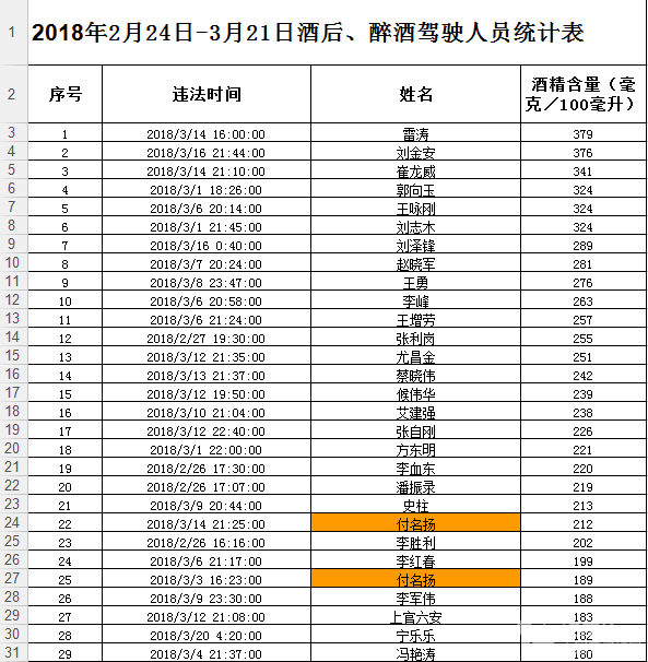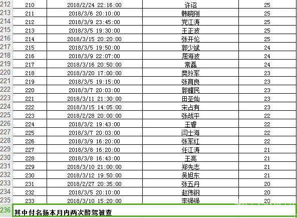 記者從現(xiàn)場(chǎng)了解到,從2月24日至3月21日共查處酒后、醉酒駕駛?cè)藛T234人,其中付某本月內(nèi)兩次醉駕被查,在通報(bào)人員中最高酒精含量379mg/100m,酒后、醉酒駕駛情況依然嚴(yán)重。