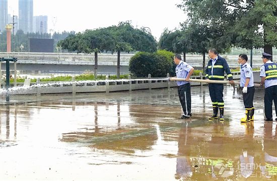 ![]() 8月23日,三門峽國際文博城南廣場,職工在用高壓水槍清理淤泥等雜物。