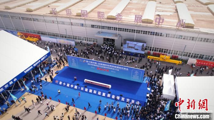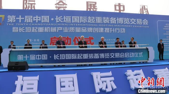 4月16日,第十屆中國(guó)·長(zhǎng)垣國(guó)際起重裝備博覽交易會(huì)在河南長(zhǎng)垣啟幕。本屆交易會(huì)吸引了來自國(guó)內(nèi)外330余家企業(yè)在此集中展示行業(yè)新技術(shù)、新產(chǎn)品、新應(yīng)用。圖為啟動(dòng)儀式現(xiàn)場(chǎng)。(無人機(jī)照片)中新社記者 李超慶 攝