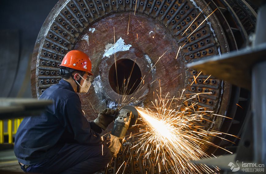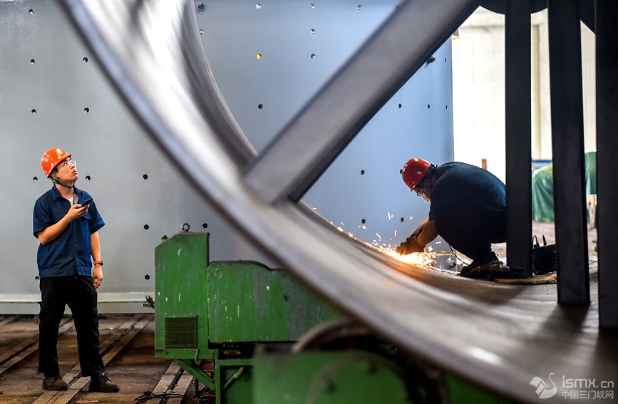 洛陽(yáng)市中信重工鉚焊車(chē)間內(nèi),工人正在加工打磨處理一批出口的礦用磨機(jī)產(chǎn)品訂單。黃政偉攝