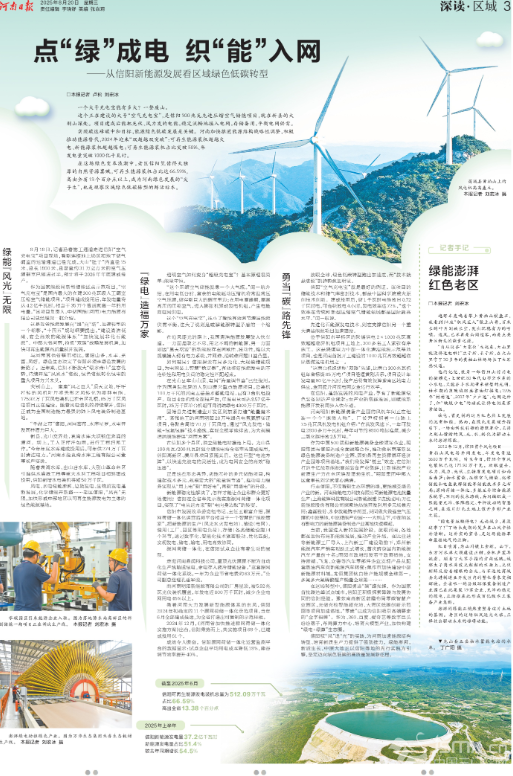 澎湃綠電助推綠色產(chǎn)業(yè)。圖為萬華生態(tài)集團(tuán)禾香生態(tài)板材生產(chǎn)線(劉宏冰 攝) 當(dāng)前,我國進(jìn)入新的發(fā)展階段,放眼河南,各地都在加快布局新能源發(fā)展,推動(dòng)產(chǎn)業(yè)升級(jí)。在比亞迪等新能源工廠導(dǎo)入、上汽新工廠建設(shè)助推下,鄭州新能源汽車產(chǎn)銷實(shí)現(xiàn)躍遷式增長,首次躋身國內(nèi)新能源汽車產(chǎn)量前十名;南陽市政府印發(fā)若干政策措施,支持淅減、飛龍、眾德等汽車零部件企業(yè)實(shí)現(xiàn)產(chǎn)品從配套燃油汽車向新能源汽車轉(zhuǎn)變;焦作市加快建設(shè)中部新能源材料城,龍佰集團(tuán)鈦白粉產(chǎn)能規(guī)模全球第一,多氟多六氟磷酸鋰產(chǎn)銷量全球第一…… 在這場(chǎng)轉(zhuǎn)型中,信陽勇當(dāng)“碳”路先鋒。作為國家首批碳達(dá)峰試點(diǎn)城市,信陽正積極探索降碳與發(fā)展協(xié)同的信陽經(jīng)驗(yàn)。豫東南高新區(qū)前瞻布局零碳智慧產(chǎn)業(yè)園區(qū),光儲(chǔ)充檢智能超充站、大灣區(qū)低碳創(chuàng)新示范園等項(xiàng)目加速落地。“零碳”已成為信陽吸引高端要素的“金字招牌”。華為、360、百度、愛奇藝等數(shù)字巨頭紛紛落子,布局算力中心、培育大模型產(chǎn)業(yè),加快構(gòu)建“綠電+綠算”生態(tài)圈。 信陽馭“風(fēng)”追“光”的實(shí)踐,為河南加速能源結(jié)構(gòu)轉(zhuǎn)型、培育新質(zhì)生產(chǎn)力提供了強(qiáng)勁推力。綠能澎湃,新質(zhì)生長,中原大地正以信陽等地的先行實(shí)踐為引擎,堅(jiān)定邁向綠色低碳的高質(zhì)量發(fā)展新征程。 記者手記:綠能澎湃紅色老區(qū) 河南日?qǐng)?bào)客戶端記者 劉宏冰 越野車轟鳴著攀上黃柏山棋盤石,我看到24座“馭風(fēng)巨人”傲立山脊,百米長的葉片劃破長空,發(fā)出沉穩(wěn)有力的呼嘯。這風(fēng),已不再是山間過客,而是點(diǎn)亮老區(qū)新生的能量之源。 “自從這些‘大家伙’立起來,大山里就沒停過電啦!”生于斯、長于斯,在大山里守了30多年的黃柏山林場(chǎng)場(chǎng)長丁大軍感嘆道。