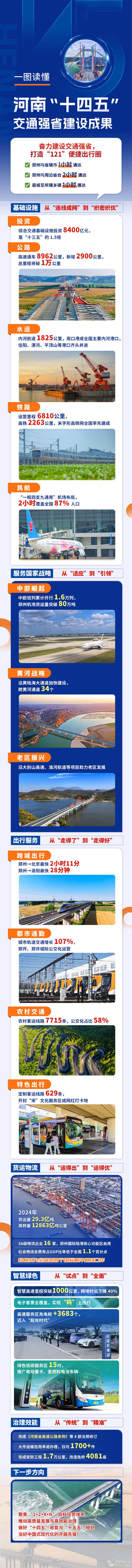 人民網(wǎng)鄭州10月14日電 (程明輝)跨城出行“拎包走”、都市通勤“像串門”、個(gè)性出行“特色足”……10月13日,河南省舉行“十四五”系列主題新聞發(fā)布會(huì),會(huì)上披露,“十四五”以來(lái),河南交通強(qiáng)省建設(shè)邁出堅(jiān)實(shí)步伐,一個(gè)更高效、更智能、更暖心的中原綜合立體交通網(wǎng)正逐步成型。 “鄭州與省轄市1小時(shí)通達(dá)、鄭州與周邊省會(huì)城市2小時(shí)通達(dá)、縣城至所轄鄉(xiāng)鎮(zhèn)1小時(shí)通達(dá),全省‘121’便捷出行格局基本形成。”河南省交通運(yùn)輸廳黨組書記、廳長(zhǎng)付磊介紹,“十四五”期間,河南綜合交通基礎(chǔ)設(shè)施投資將達(dá)8400億元,是“十三五”的1.5倍,全省綜合交通網(wǎng)總規(guī)模達(dá)29.2萬(wàn)公里。 公路方面,高速公路通車?yán)锍桃堰_(dá)8962公里,“十四五”新增里程超2900公里,年底將突破1萬(wàn)公里,90%以上的縣邁入“雙高速”時(shí)代。普通干線公路新改建4500公里,實(shí)現(xiàn)重要節(jié)點(diǎn)二級(jí)及以上公路連通。農(nóng)村公路也成績(jī)斐然,新改建4萬(wàn)公里,“四好農(nóng)村路”全國(guó)示范縣達(dá)23個(gè)。 水運(yùn)方面,河南內(nèi)河航道里程達(dá)1825公里,周口港成為全國(guó)內(nèi)河主要港口之一,2024年全省完成港口吞吐量6085萬(wàn)噸、集裝箱10.9萬(wàn)標(biāo)箱,比“十三五”末分別增長(zhǎng)1倍、12倍。 鐵路民航同樣蓬勃發(fā)展,鐵路運(yùn)營(yíng)里程達(dá)6810公里,其中高速鐵路2263公里,率先建成“米”字形高鐵網(wǎng)。全省形成“一樞四支九通用”機(jī)場(chǎng)布局,航空運(yùn)輸2小時(shí)內(nèi)覆蓋全國(guó)87%以上人口。 在服務(wù)重大戰(zhàn)略方面,河南積極作為。“鄭州-盧森堡”“鄭州-吉隆坡”雙樞紐發(fā)力,中歐班列(鄭州)累計(jì)開(kāi)行16000列,鄭州航空港區(qū)建成內(nèi)陸首個(gè)國(guó)際公路運(yùn)輸集結(jié)中心。同時(shí),沿黃陸海大通道加快建設(shè),跨黃河運(yùn)輸通道達(dá)34個(gè),沿大別山高速等項(xiàng)目建成通車,為老區(qū)發(fā)展注入新動(dòng)能。 便捷群眾出行也是河南交通發(fā)展的重點(diǎn)?绯浅鲂“拎包走”,鄭州到北京最快2小時(shí)11分,到洛陽(yáng)高鐵28分鐘直達(dá)。都市通勤“像串門”,城市軌道交通運(yùn)營(yíng)里程增加220公里,鄭開(kāi)、鄭許城際公交化運(yùn)營(yíng),通勤成本降低近一半。農(nóng)村交通“有保障”,開(kāi)通農(nóng)村客運(yùn)線路7715條,公交化運(yùn)營(yíng)占比58%。此外,全省新增定制客運(yùn)線路629條,“交通+醫(yī)療”等特色服務(wù)不斷創(chuàng)新。 在貨物運(yùn)輸方面,河南正由“內(nèi)陸腹地”向“物流樞紐”加速轉(zhuǎn)變。2024年全省累計(jì)完成貨運(yùn)量29.3億噸、貨運(yùn)周轉(zhuǎn)量12863億噸公里,比“十三五”末分別增長(zhǎng)34%、48%。郵政快遞也進(jìn)階提質(zhì),2024年完成郵政行業(yè)業(yè)務(wù)收入727.3億元、快遞業(yè)務(wù)量90.5億件,比“十三五”末分別增長(zhǎng)79%、192%。 智慧綠色發(fā)展同樣亮點(diǎn)紛呈。智慧高速里程突破1000公里,智慧擴(kuò)容試點(diǎn)路段改造后擁堵總時(shí)長(zhǎng)有望下降40%。綠色交通方面,城市公交基本實(shí)現(xiàn)新能源化,全省高速公路服務(wù)區(qū)新增充電樁3683個(gè),邁入“超充時(shí)代”。 一圖讀懂河南“十四五”交通強(qiáng)省建設(shè)成果